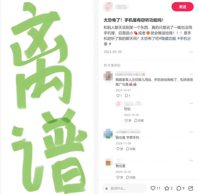 在国内社交平台小红书上,很多网友表示,与家人、朋友、同事讨论了一些产品后,立即收到了相关产品的推送,怀疑手机在窃听自己的聊天,包括 iPhone 客户。