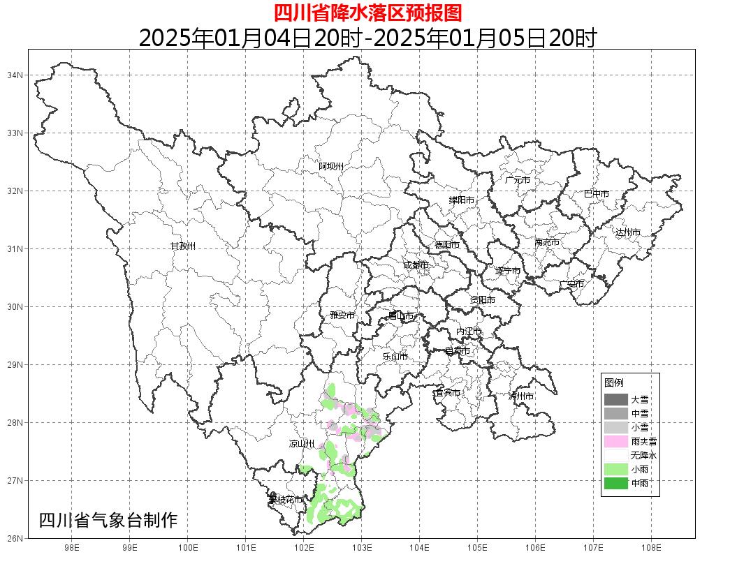 4日晚至5日白天:大部分盆地云转晴,早晨山口河谷有雾,西北有霜降;川西高原阳光明媚,攀西东南多云有分散的阵雨(雪),攀西其他地方多云晴朗。