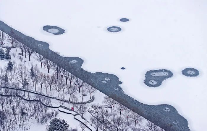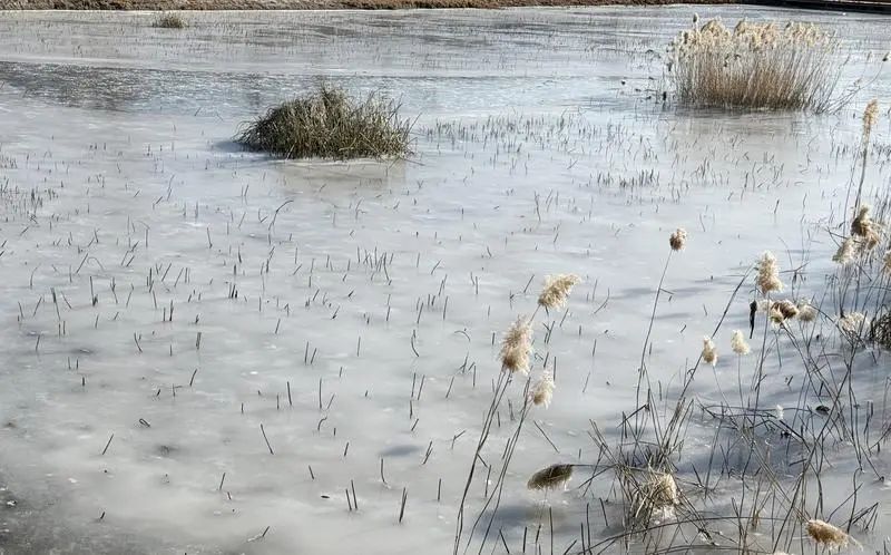 ▲太原市稻田公园,水面已经结下厚厚的冰面。