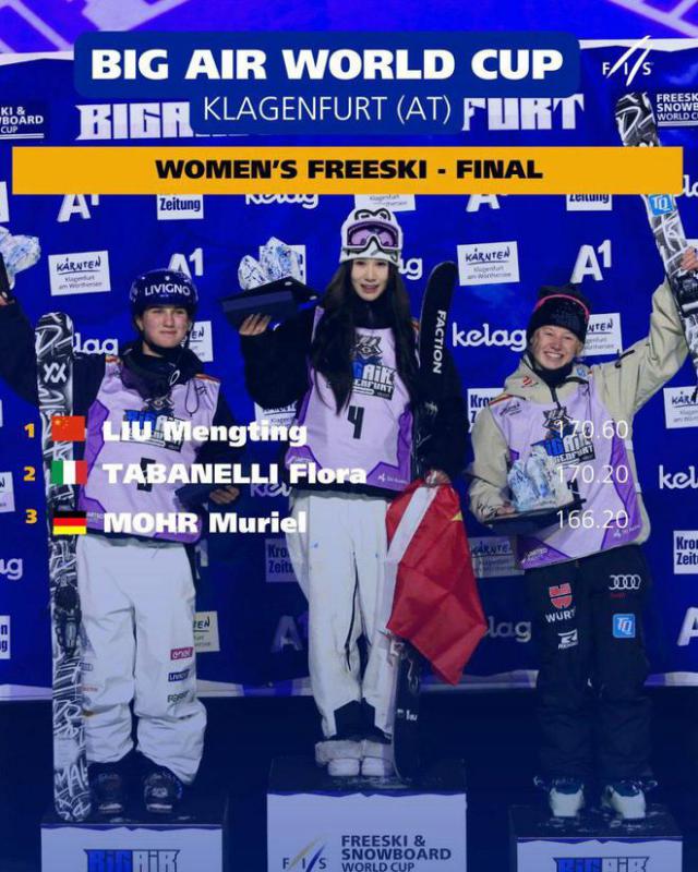 1 月 5 日凌晨,2024-25 在奥地利克拉根福举行了本赛季自由滑雪大跳台世界杯的第三场比赛。凭借前两轮高质量的完成,中国选手刘梦婷 170.60 分数分数获得冠军,这就是冠军, 20 年刘梦婷首次获得世界杯冠军。