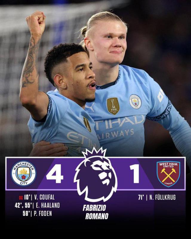 现在曼城不但赢了,头号射手哈兰德也梅开二度,最后结束了。 4 场球荒之后,已经连续了 2 场上破门,重新找回进球的感觉,也算是为了 2025 年开了个好头。