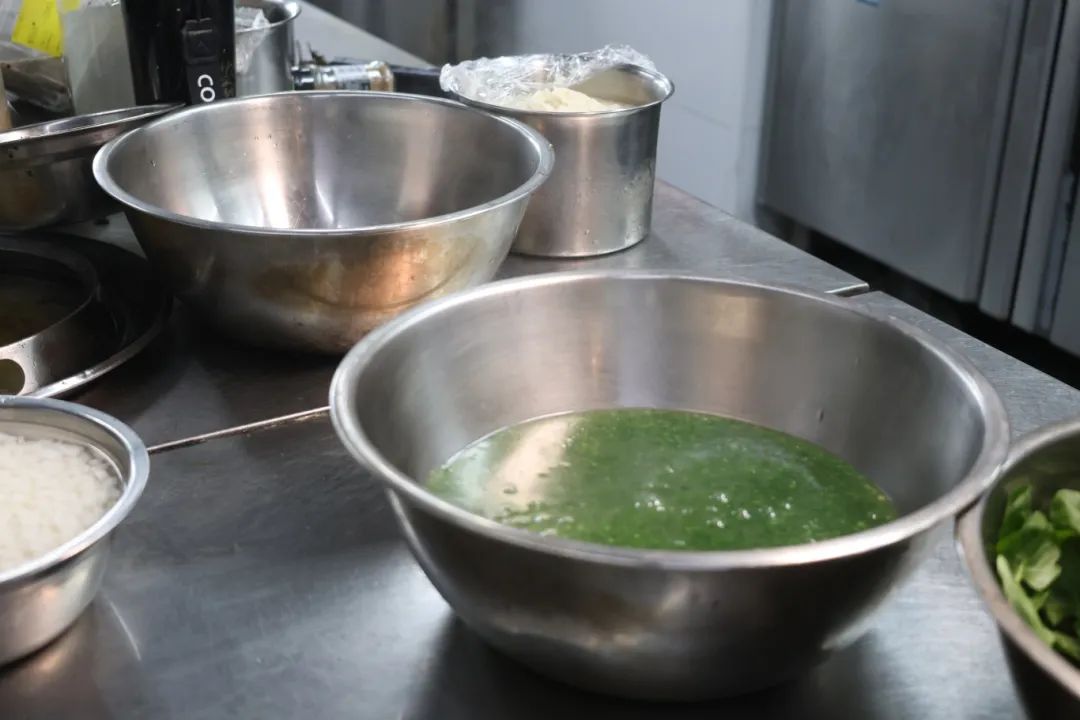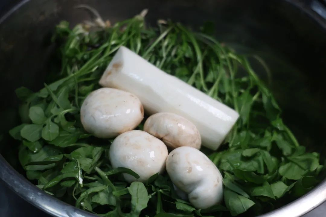 4. 将荠菜汤导出,洗净锅,将山药丁和蘑菇丁同样制成汤备用;
