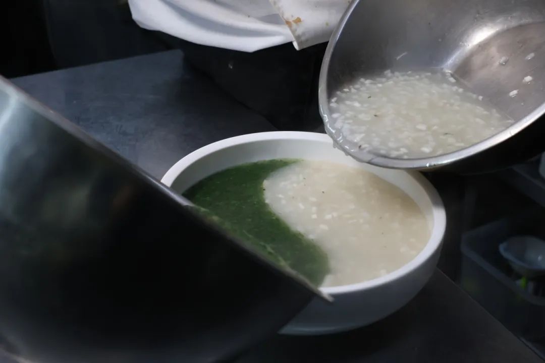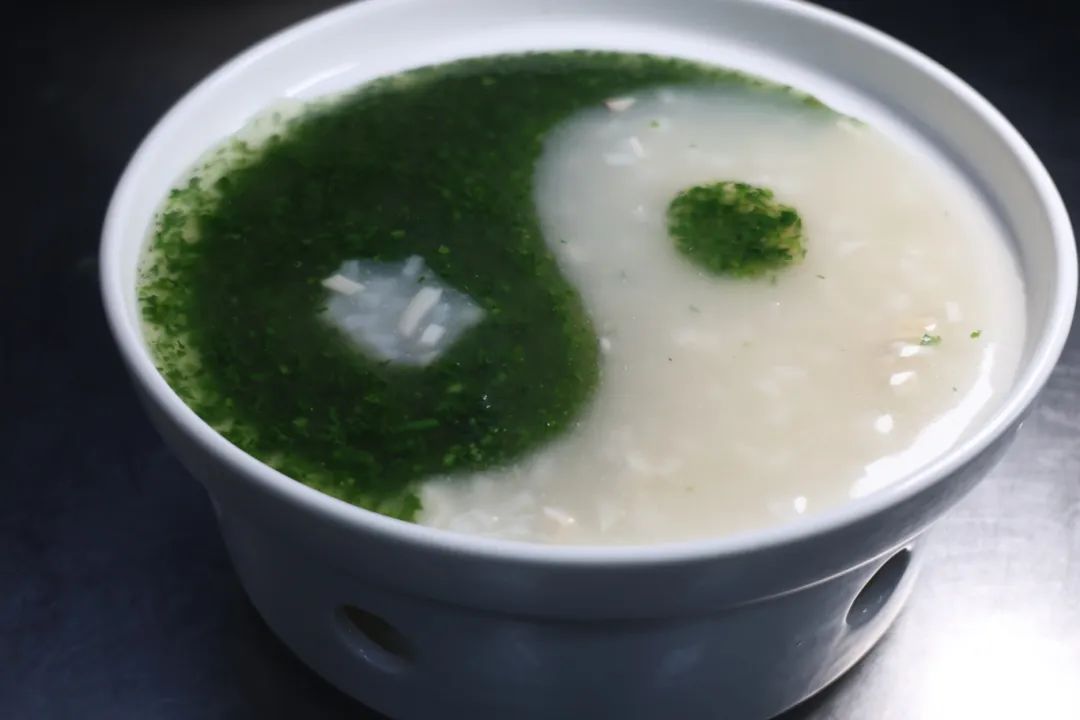 5. 准备一个大一点的汤碗,同时在碗的两侧倒入两个汤,然后慢慢转圈,形成太极图。然后用勺子在两个汤上加入一勺不同颜色的汤,完成翡翠白玉太极汤。