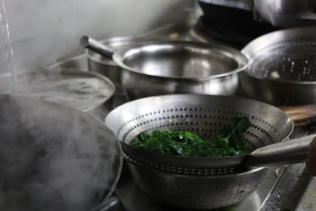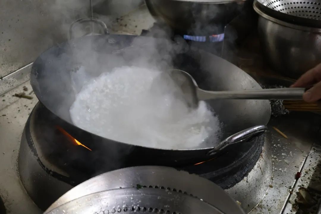 3. 锅内加入凉水,加入荠菜,加入生粉,根据个人口味,加入适量的盐、味精;