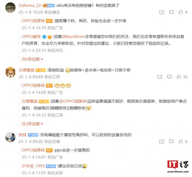 针对 Find X8 Ultra 手机是否配有拍照按钮,周意保回复“提前爆料”,有些,感觉也将进一步升级";对于新机充电器的兼容性是否有所提高,他说:PPS 这将进一步改善";是否可以推出手机远程控制? PC “软件,他指出”好的"。