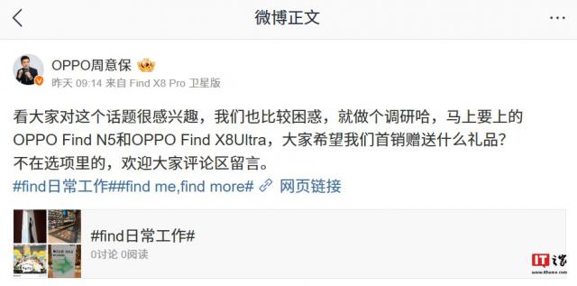 IT 世家 1 月 5 日消息,OPPO Find 该系列产品负责人周意保昨天在微博上发起" OPPO Find N5 和 OPPO Find X8 Ultra 首次赠送礼品“投票活动”,并在评论区透露了一些新机器信息。