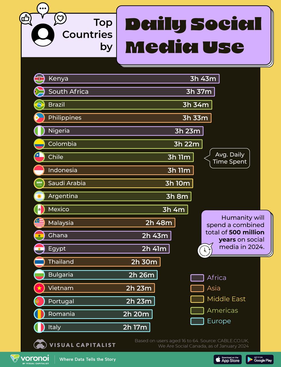 目前,非洲几乎也是全球使用社交媒体时间最长的地区。Voronoi 数据显示,肯尼亚人均每天在社交媒体上花费 3 小时 43 分钟,位居全球社交媒体使用时间排行榜首位;南非、尼日利亚社交媒体参与度也很高,人均每天在社交媒体上花费均超过3小时,在全球社交媒体使用时间排行榜分别位列第二和第五。