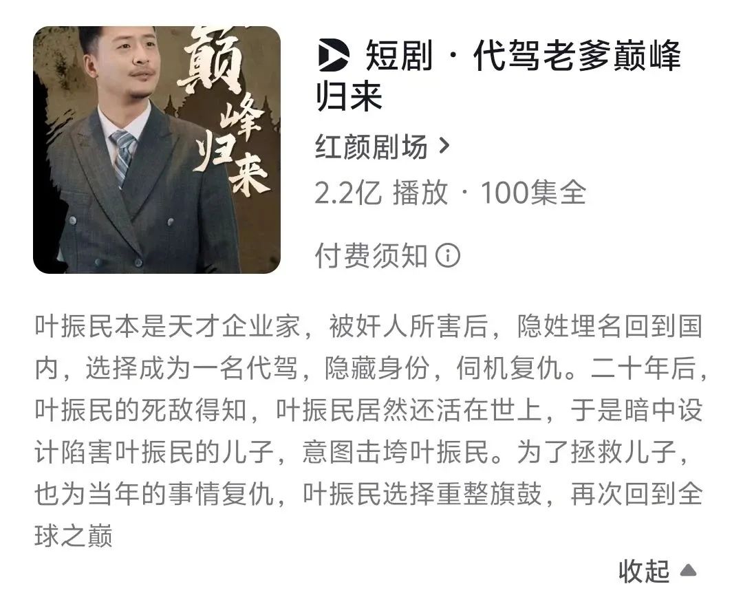 不仅有针对妈妈辈的温情、甜宠类短剧,也有男频中老年短剧,代表作有《代驾老爹巅峰归来》《犬父虎子》《老炮儿之上阵父子兵》,充分诠释什么叫“男人至死是少年”。