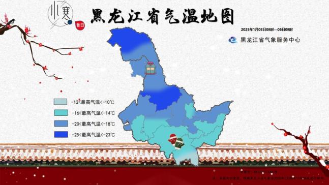 一月五日(小寒第一天)白天气温最高:大兴安岭北部,黑河南部-25~-大兴安岭南部,黑河北部,伊春,齐齐哈尔,绥化北部,鹤岗东部,佳木斯-20℃,~-牡丹江南部18℃-12℃~-10℃,其他地区-16℃~-14℃。