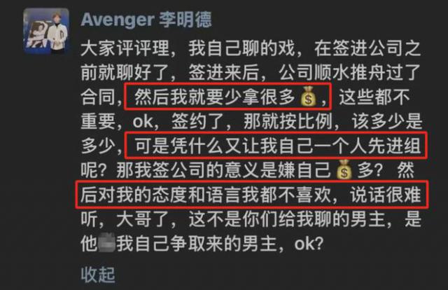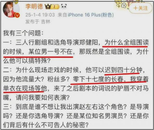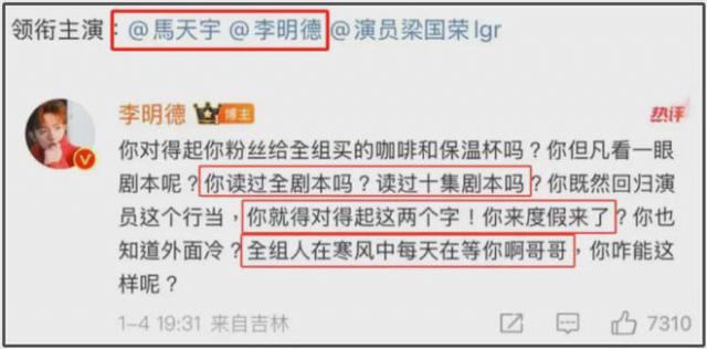 首先要记住当事人,网上崩溃的明星叫李明德,出生于李明德, 1996 年份,不久前才过完自己。 28 在他的生日那天,当数百名明星愉快地参加星光奖时,李明德在屏幕上发布了一条轰炸电视剧《三人行》的短信,愤怒地斥责娱乐圈的资本,喊着娱乐圈已经结束,瞬间占据了热搜,成为整个娱乐圈唯一的焦点。
