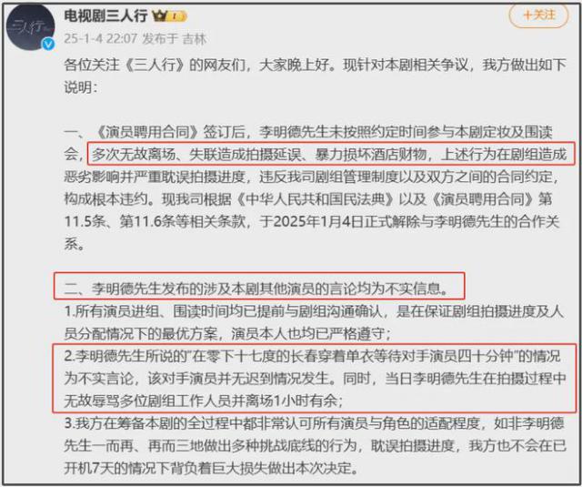 随后《三人行》剧组做出回应,提到李明德没有按照约定的时间参加化妆和围读会,几次无缘无故离开,导致拍摄延误,酒店财产受到暴力损坏,与业内陈述相匹配,并释放证据。