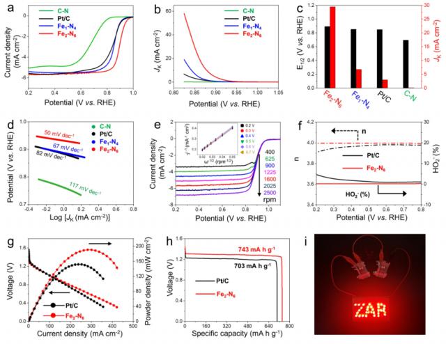 结果表明,这种双原子铁催化剂具有优异的催化活性、耐复杂的环境能力和长期稳定性。锌由这种双原子铁催化剂组装而成 - 空气电池,显示高达 190.6 每平方厘米毫瓦的最大功率密度明显优于传统铂催化剂组装的电池(151.71. 每平方厘米毫瓦)。