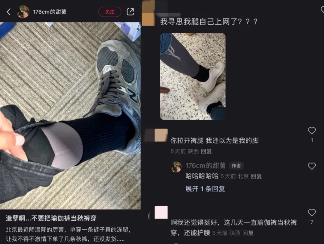 东北人认为,「瑜伽裤 羊绒牛仔裤,张家口人冬季组合」,还有人表示「薄绒瑜伽裤更加保暖,还没有勒腿。」,更多的评论区直言不讳「把健身裤当秋裤穿,外裤一脱就可以运动,冬季运动好搭配。」。