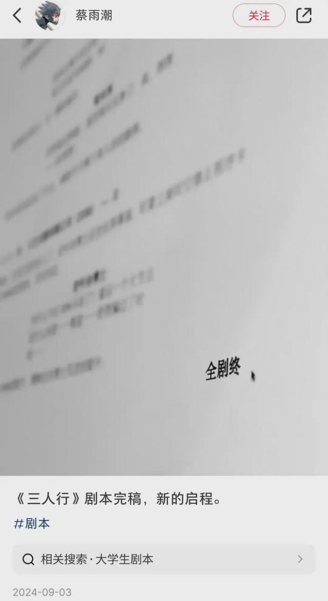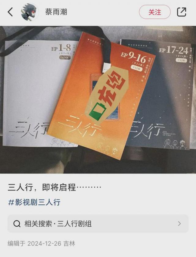 整理《三人行》剧组的进展,从制片人蔡雨潮的动态可以窥探一二。去年 9 月亮,剧本完成,11 月定景,12 月 26 日晒纸质剧本。然而,纸质剧本与马天宇的描述不符。马天宇在回应中含蓄地提到,他不习惯看电子剧本,制片人在开机前就有了纸质剧本。