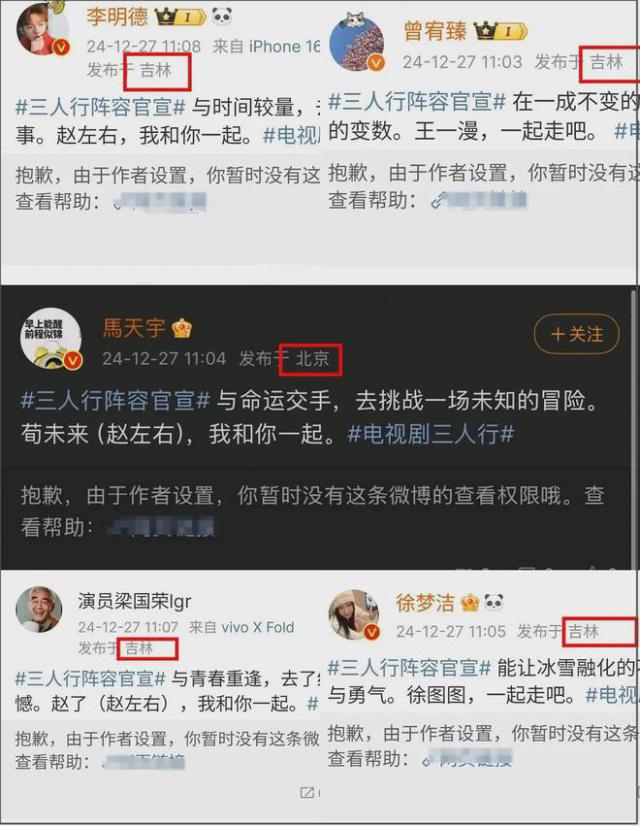 提到《三人行》剧组,马天宇删除了另一部分微博,被网友猜测是销毁证据。然而,他删除微博的行为反映了李明德爆料“马天宇没有参加剧组阅读”的真实性。细心的网友发现,剧组当天正式宣布其他演员。 IP 都是吉林,只有马天宇在北京。