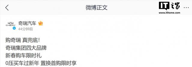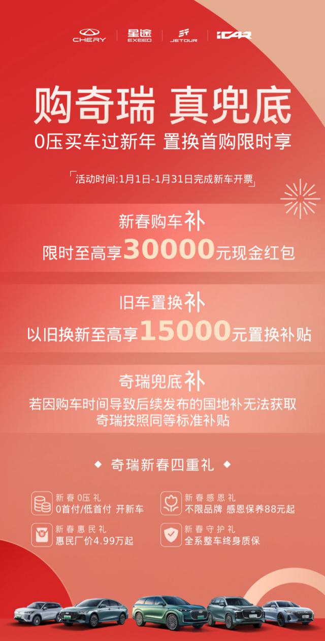 IT 世家 1 月 5 今天,奇瑞汽车官方宣布,奇瑞集团四大品牌(奇瑞、星途、捷途、捷途、iCAR)如果因为买车时间而导致后续发布的国地补贴无法获得,奇瑞将按同等标准补贴。