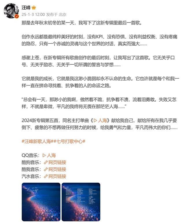 值得注意的是,3 日汪峰发布了新歌《人海》。网民们纷纷表示:“内娱流水的瓜,雷打不动的汪峰定律。”“竟然是汪峰老师发力了。”