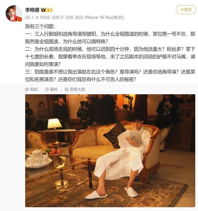 1 月 4 一天下午,演员李明德发文称电视剧《三人行》剧组搞区别对待,相关话题冲上热搜第一。