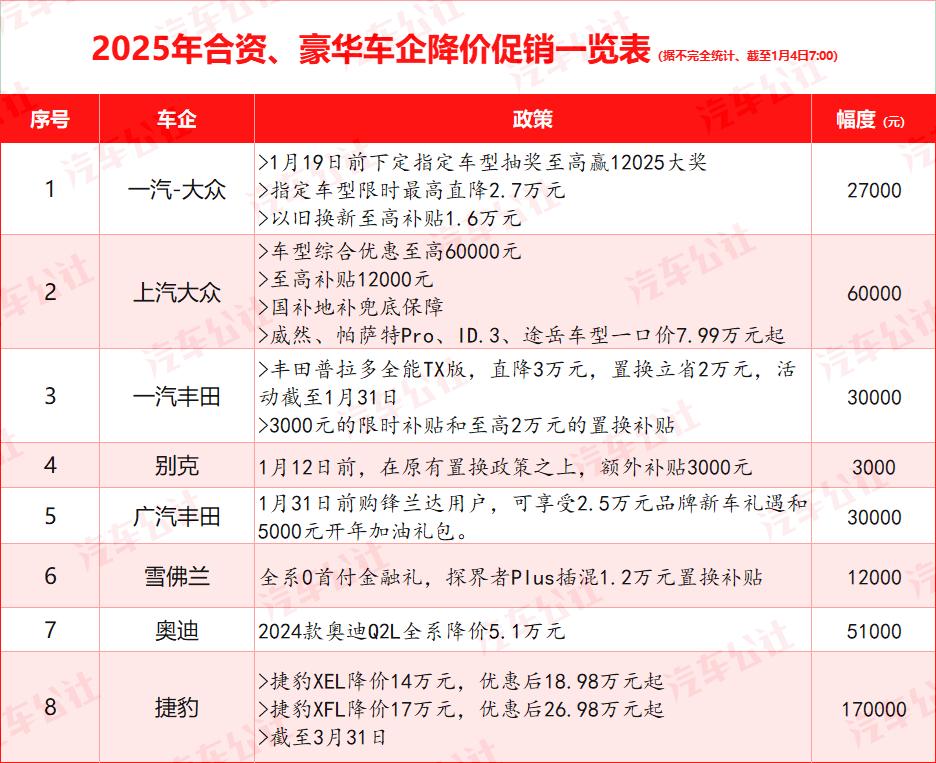 从降价和优惠力度来看,一汽-大众、上汽大众、一汽丰田普拉多、奥迪等。,现金总是暴跌3万到5万,促销力度极其可观。就连二线豪华品牌捷豹,最高减幅也达到了17万元,一辆豪华车可以以合资B级车的价格驾驶。