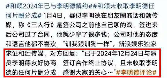 另外,与李明德合作三个月的经纪公司“和颂”(由李冰冰姐妹经营)也在去年 12 每月与李明德提前结束合作,双方不涉及赔偿费用。