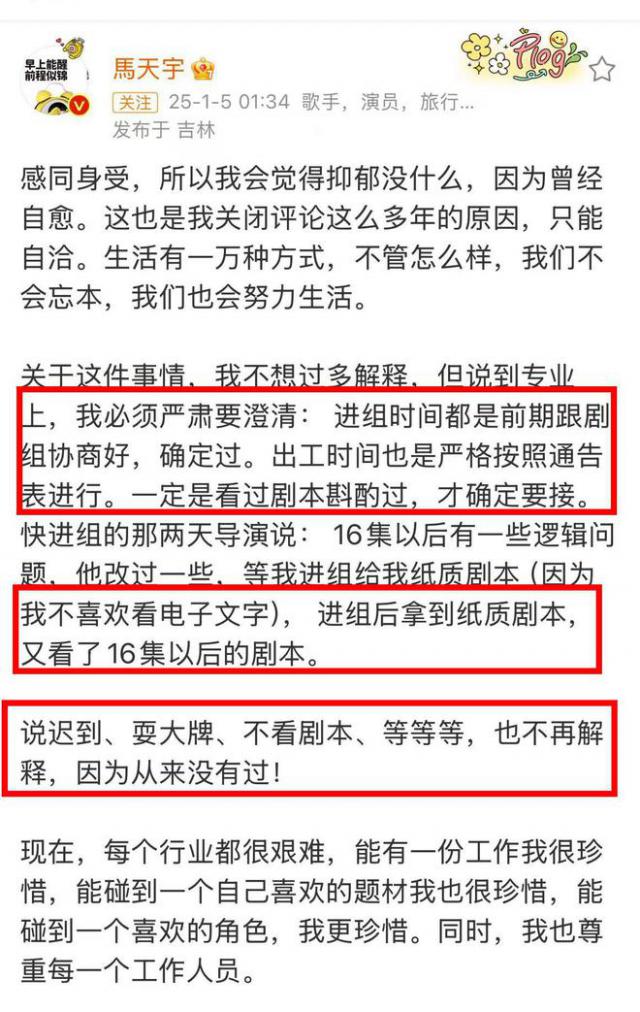 马天宇否认不看剧本也不迟到,把责任推给剧组,嘲讽李明德患狂躁症。