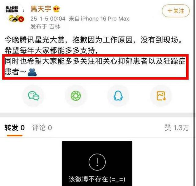 马天宇删除“请多关注和关注抑郁症患者和易怒患者”后,发文解释说自己患有抑郁症,所以对生病的人有很深的了解。