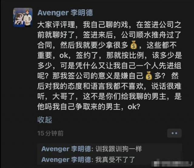 李明德吐槽说,他和公司签了合同后,不仅没有得到对方的照顾,还给了对方钱。即使他谈论的戏剧也是佣金,合作也不愉快。经纪人像“训狗”一样和他说话。