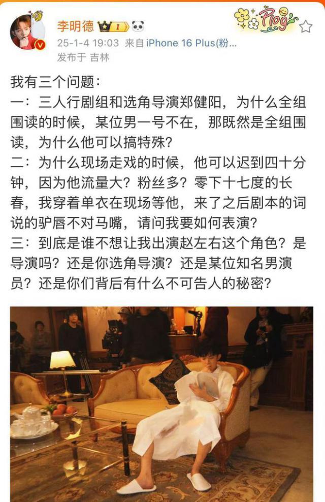 在《三人行》中,李明德主要指责剧组受到不公平待遇。