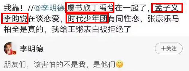 为了提高爆料的吸引力,李明德在留言区曝光了其他演员的隐私,说虞书欣爱上了丁禹兮,说孟子义和李昀锐真的在一起了。 …… 还有时代青年团的材料。