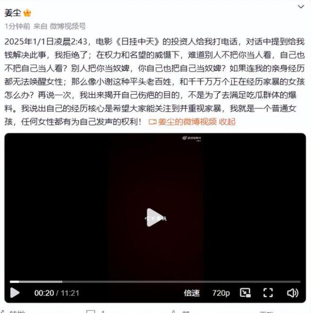 1 月 5 日本,姜尘发布了一段音频,爆料电影《日挂中天》的投资人打电话给她,指出对方想给钱,姜尘当场拒绝,还说自己曝光这件事不是为了钱,没想到张颂文这么火。