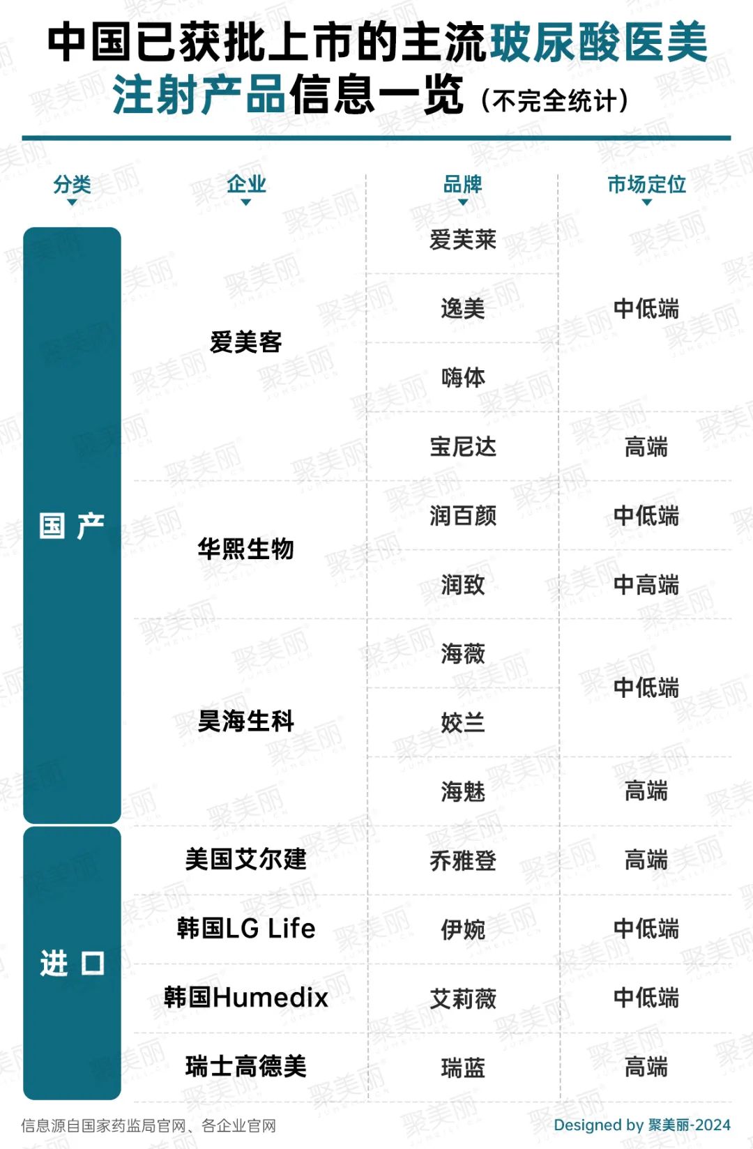 据统计,截至2024年11月,国内已有15家企业批准34种玻尿酸注射产品,17家企业批准39种进口玻尿酸注射产品。目前主流的玻尿酸产品有爱芙莱、易美等。爱美客,华西生物的润百颜、润致等。,浩海生物科的海薇和美兰,以及艾尔建的乔雅登和乔雅登。LG 伊婉,Humedix的艾莉薇,高德美的瑞蓝等等。