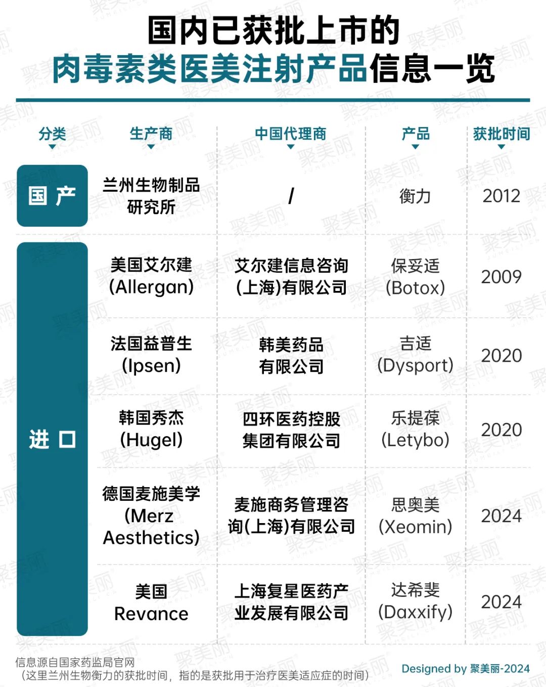据统计,到目前为止,中国已经批准上市了6种肉毒杆菌毒素产品,分别是兰州生物的衡力、美国艾尔建的保妥适、法国益普生的吉适、韩国秀杰的乐提葆、德国麦施美学的思奥美和美国的达希斐。