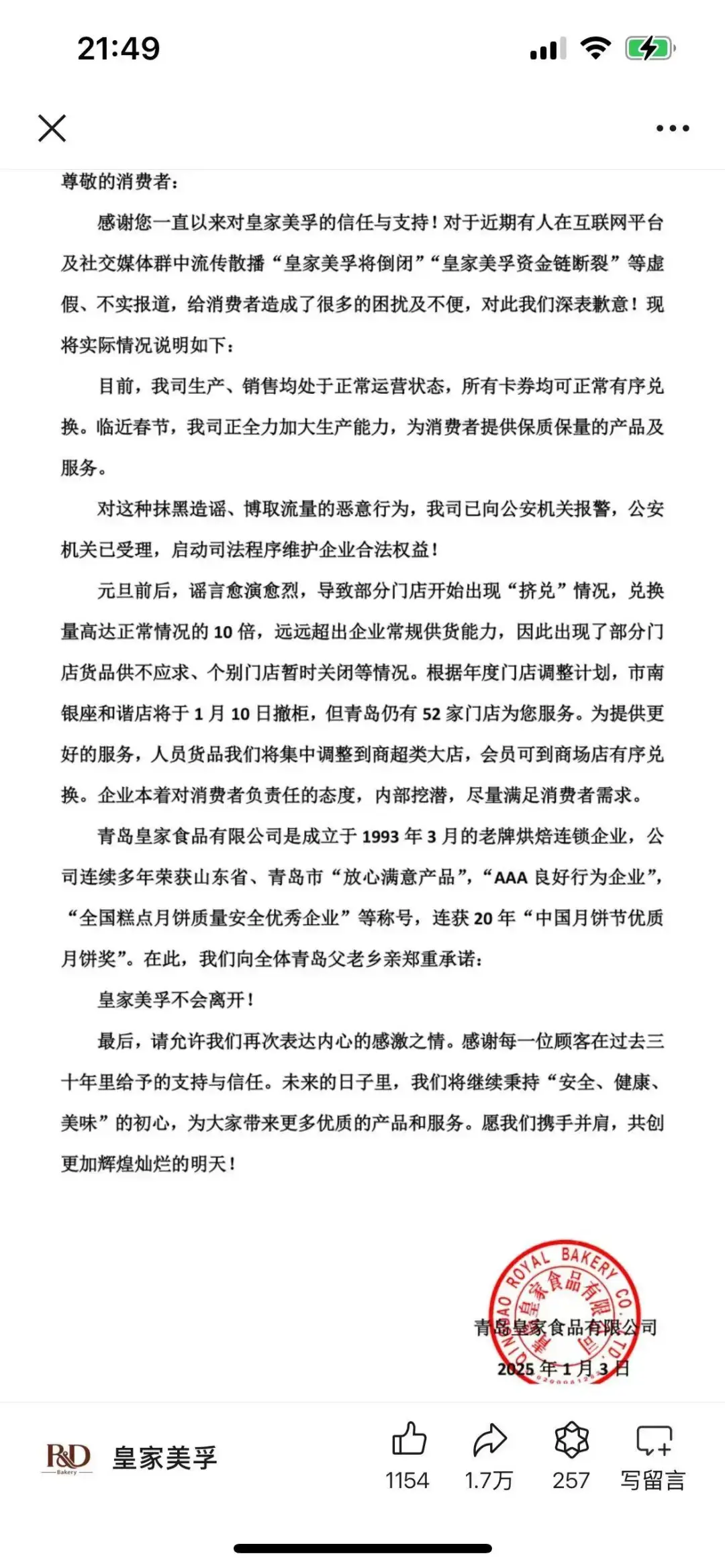 1月3日,皇家美孚再次发表声明重申,目前公司生产销售处于正常运营状态,所有卡券都可以正常有序交换。此外,皇家美孚解释说,元旦后关于企业倒闭的谣言越来越严重,部分门店“排挤”,远远超出公司的常规供应能力。因此,一些门店供不应求,一些门店暂时关闭。