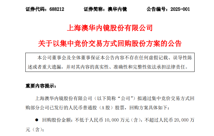 澳华内镜(688212)计划通过集中竞价交易回购部分股票,回购股份额不低于人民币1亿元,不超过人民币2亿元。回购股份的资金来源是公司自筹资金和中信股份有限公司上海分行提供的股票回购专项贷款。回购股份价格不超过人民币45元/股。