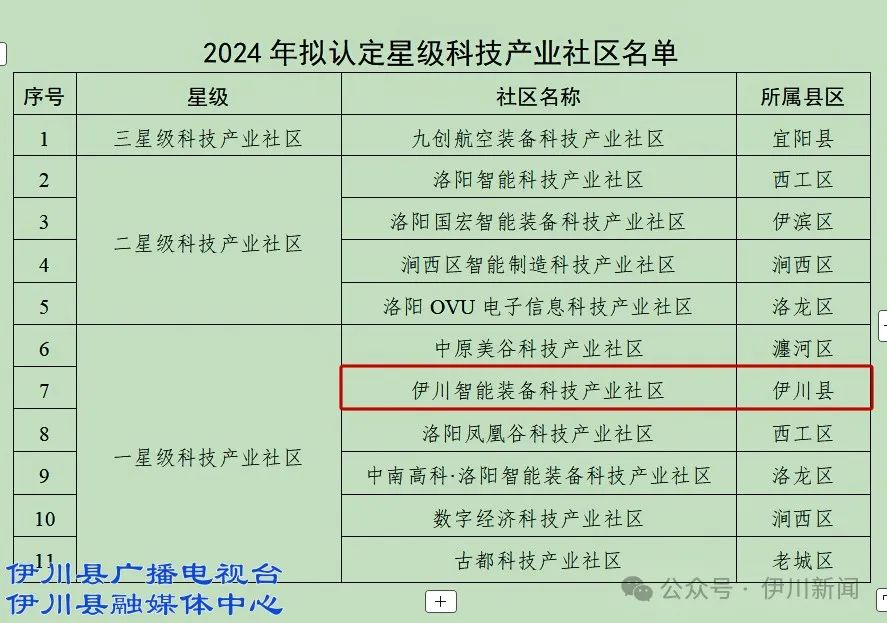 近日,洛阳市工业信息化局发布《关于2024年拟认定星级科技产业社区名单的公示》。经社区申请、县区推荐、专家评审,伊川智能设备技术产业社区被认定为一星级技术产业社区。