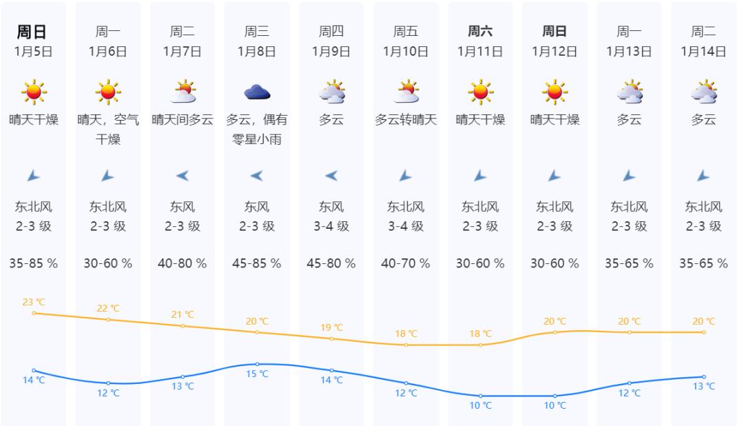 一月五日,晴天,空气干燥,气温14℃-23℃。;东北风2-3级;相对湿度为35%-85%。