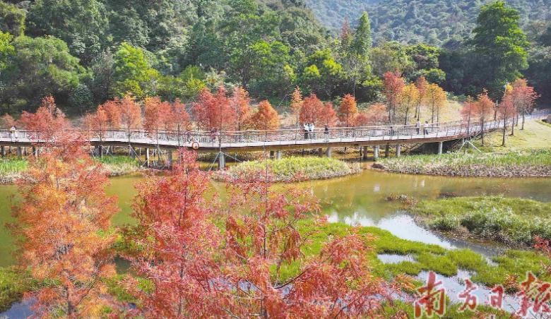 日前,深圳市坪山区头陂公园,色彩斑斓的落羽杉已进入最佳观赏期,吸引众多市民游客前来打卡。