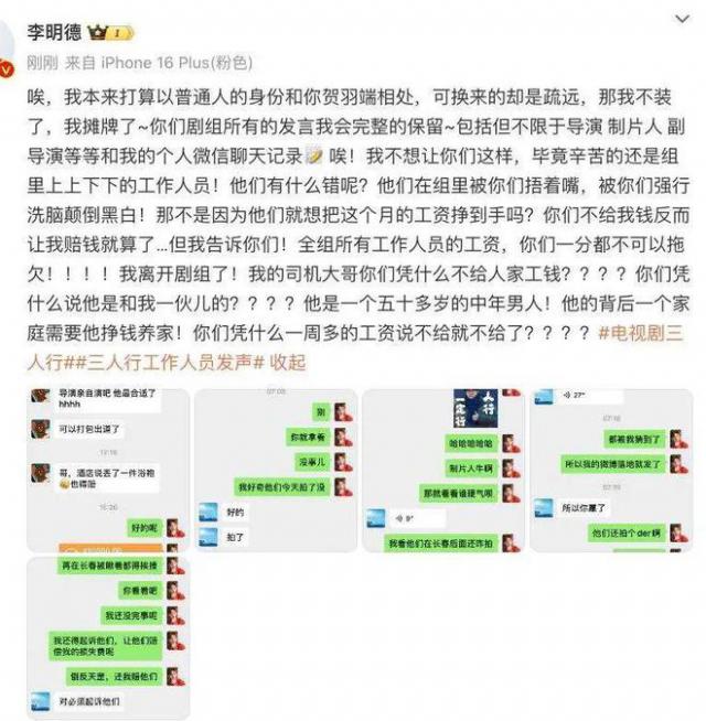 近日,演员李明德在社交平台上爆料《三人行》剧组区别对待,并指责第一英雄马天宇扮演大牌,引起关注。《三人行》剧组发表声明称,李明德没有按照约定的时间参加化妆和围读会,多次无故离开,导致拍摄延误,酒店财产受到暴力损坏,构成根本违约,已经成为根本违约。 1 月 4 每天宣布消除与他们的合作关系。