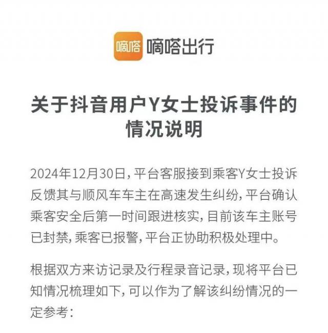 1 月 5 日前,针对近期网友爆料搭便车车主与乘客在高速公路上发生纠纷的消息,迪达公司发布官方信息,整理行程相关信息,称平台在收到投诉后第一时间确定乘客安全,并及时跟进核查。目前平台正在协助相关部门积极处理。