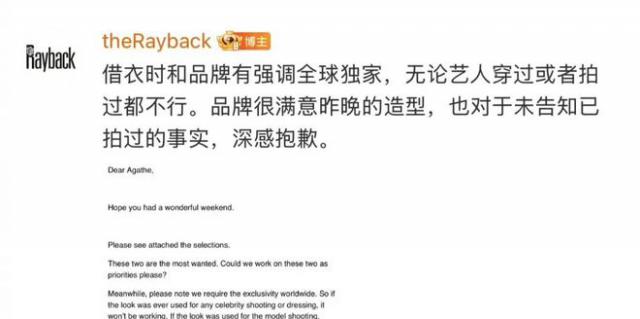 闵塔鲨造型工作室在评论区道歉:“借衣服的时候,无论是艺人穿的还是演的,都强调全球独家。品牌对昨晚的造型非常满意,对于没有告诉拍摄的事实深感遗憾。” 并且附上品牌商邮件,还表示对此次疏忽表示歉意,很乐意在其它项目中再次合作。