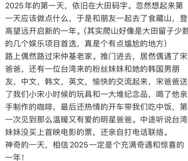 1 月 5 日本,有网友分享了去韩国演员宋仲基田地老家登山的消息。幸运的是,网友们偶然遇到了宋仲基的父亲,参观了宋仲基曾经住过的地方。