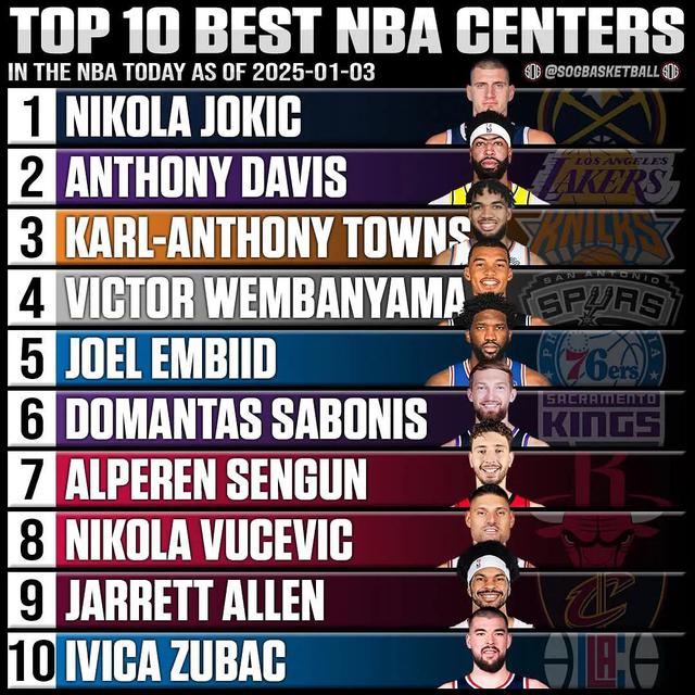 2025 约基奇、戴维斯、唐斯、文班亚马、恩比德、萨博尼斯、申京、武切维奇、贾勒特阿伦、祖巴茨、祖巴茨是目前中锋位置最好的球员。