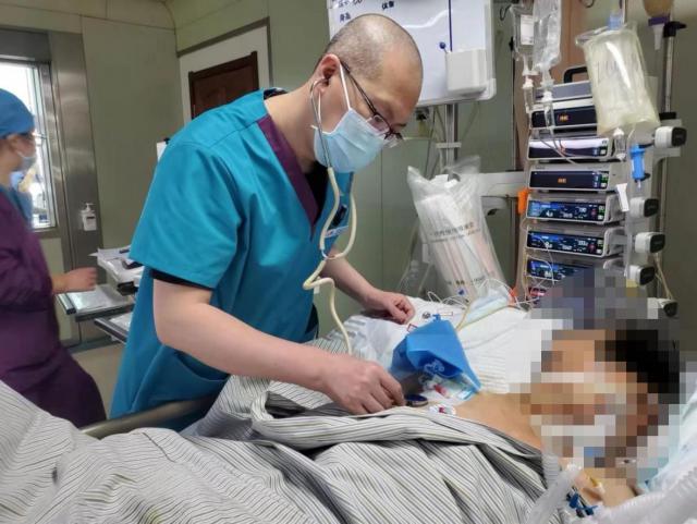 60号国庆当天 年迈的马女士原本在家与家人团聚,但突发急性心肌梗死,立即被送往哈医大一院重症医学科。 F 病房治疗。收入 ICU 随后,病人突然心跳骤停,值班的重症医学科副主任、主任医师费东生立即带领医生李尧、康献鑫为病人进行心肺复苏。