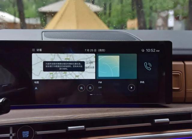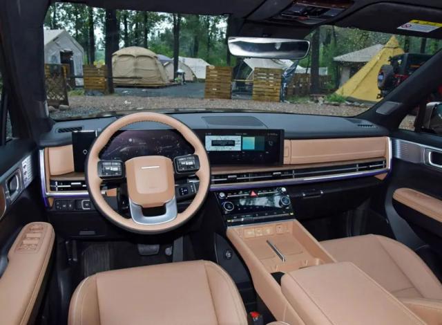 虽然驾驶舱使用了一些坚韧的线条,但并没有完全倒入硬核越野的风格。大面积的软质材料更简单更高级,整体风格更倾向于在家舒适。双 12.3 英尺大联屏非常现代,车机系统功能丰富,系统流畅性好,前面还有 HUD 抬头显示,可以说是把所有能想到的功能都配上了。