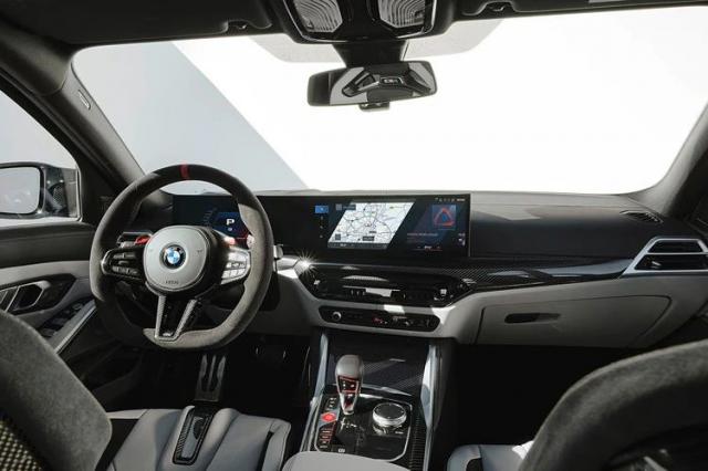 在造型上,新车是基于 M3 建造,在某些位置进行了升级调整,大小的双肾格栅是标志性元素,但内部细节和新款式 M3 还有差别。另外,大灯组内部的结构也进行了调整,这款搭载的双重结构 C 形 LED 日间行车灯采用倒钩形设计,视觉效果更佳。