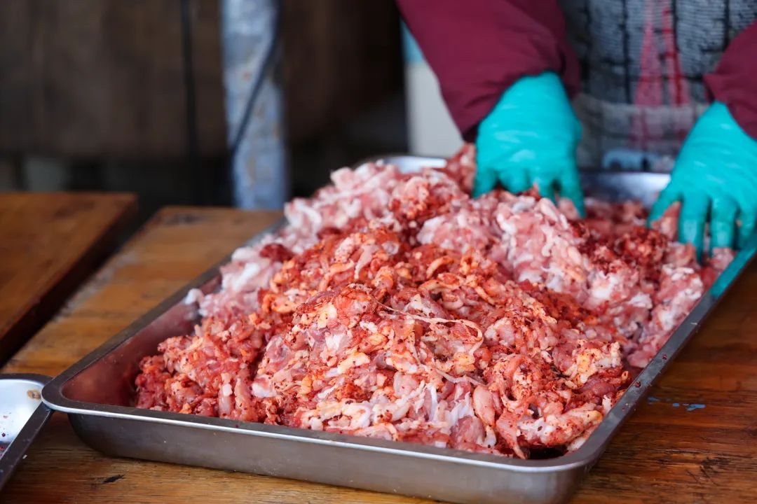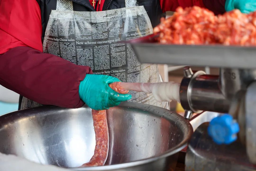 店主李惠娟正忙着灌香肠。她告诉记者,冬月是灌香肠的好时机。今年,她精心挑选了又胖又瘦的新鲜三明治肉,设计了五香、麻辣、广式等多种口味的香肠。随着春节的临近,市民的需求越来越大,她平均每天要灌四五十斤肉。