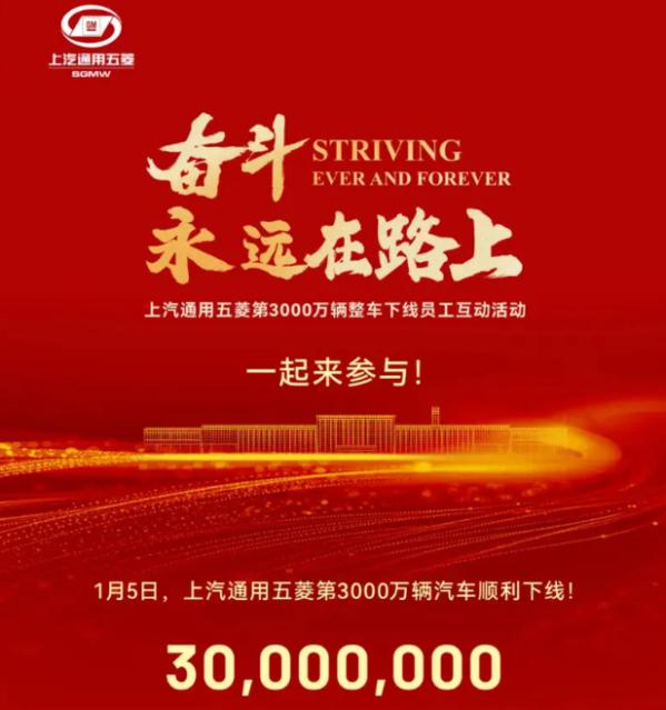 1 月 5 上汽通用五菱宣布第一天 3000 万辆全车正式下线,下线车型为五菱星光。 S。上汽通用五菱已成为首个累计销售额。 3000 中国品牌车企万台。