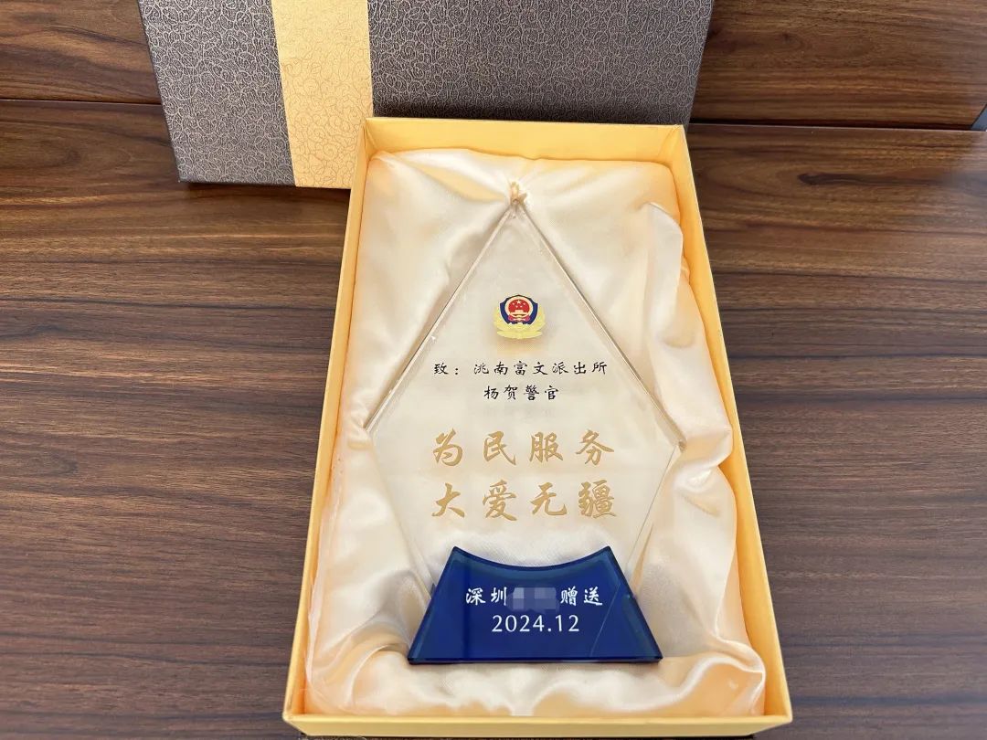 "杨警官,杨警官在吗?这儿有一份从深圳寄来的快递,请您签收… 1月2日,南方派出所富文派出所民警杨贺收到广东省深圳市的快递。当他打开它时,他看到里面有一枚印有“为人民服务,大爱无国界”的奖牌。