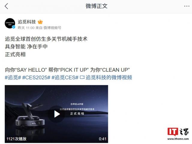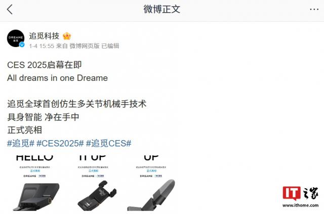 IT 世家 1 月 6 日消息,2025 国际消费电子展(CES 当地时间将于2025 1 月 7 日至 10 日本在拉斯维加斯举行。本月追寻科技(1 月 4 日本)宣布将参加 CES 2025年,将带来其“全球首创仿生多关节机械手技术”,slogan 为了“手中有身智能净”。