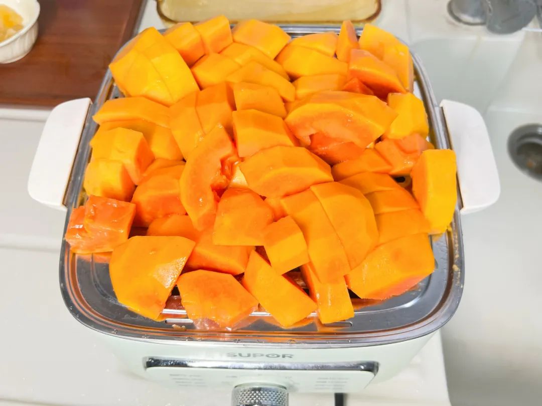 一颗木瓜(1公斤左右)去皮切块,上锅蒸10分钟;